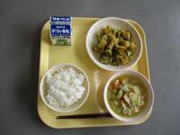 今日の給食は、ごはん、牛乳、野菜スープ、魚のカレーマリネでした。