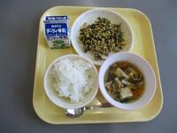 今日の給食は、ごはん、牛乳、マーボーナス、海藻サラダでした。
