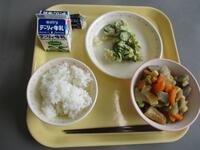 今日の給食は、ごはん、牛乳、コーンと野菜のスープ、鶏肉とゴーヤの揚げ煮でした。
