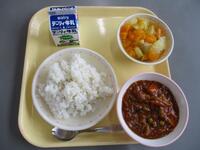 今日の給食は、牛乳、ハヤシライス、フルーツポンチでした。
