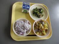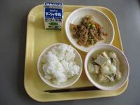 今日の給食は、牛乳、ご飯、うま煮、もやしとツナの和え物でした。