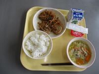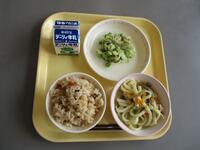 今日の給食は、牛乳、減量五目ごはん、肉うどん、枝豆サラダでした。
