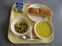 今日の給食は、牛乳、米粉パン、かぼちゃのポタージュ、野菜とウインナーのソテーでした。
