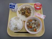 今日の給食は、牛乳、うめなめし、里芋と豚肉の煮物、白菜のゴマじゃこ和えでした。