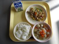 今日の給食は、牛乳、ごはん、かぶと肉団子のスープ、豚肉と厚揚げのオイスターソースでした。