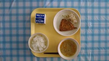 今日の給食は、「アジ磯の香チーズフライ」「もヤシのレモン和え」「中華コーンスープ」「ごはん」です。