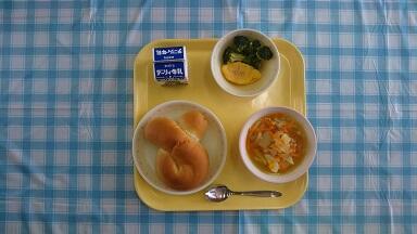 今日の給食は、「ラビオリスープ」「オムレツ」「ゆでブロッコリー」「黒糖パン」です。