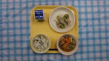 今日の給食は、「筑前煮」「マロニーの酢の物」「青菜ご飯」です。