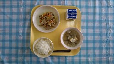 今日の給食は「じゃこ団子汁」「豚肉と野菜のみそ炒め」「ごはん」です。