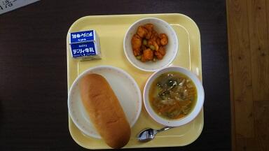 今日の献立は「オニオンスープ」「揚げ鳥のオーロラ煮」「チーズパン」でした。