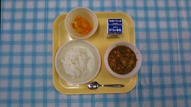 今日の献立は「チキンカレー」「フルーツカクテル」「ごはん」です。