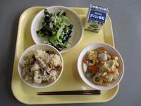 今日の給食は、牛乳、きのこごはん、イカと大根の煮物、カルシウムたっぷりサラダでした。