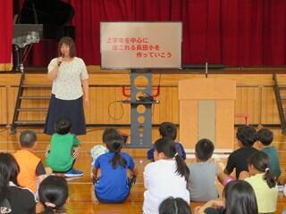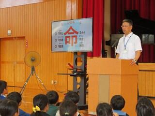 その後、校長先生からは「きらきら、にこにこ、ぐんぐん」や、「ながたの子」等のキーワードについての確認や、目標をもって2学期を過ごしてほしいという話と、「教室はまちがうところだ」の詩の紹介がありました。また、先生方から、2学期の生活面や安全面で気を付けてほしいことについて話がありました。