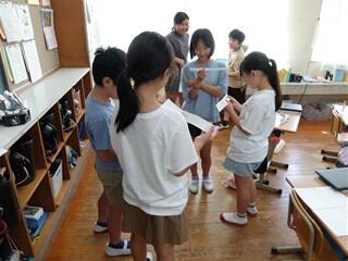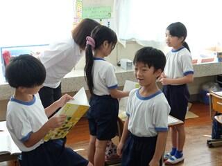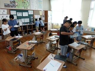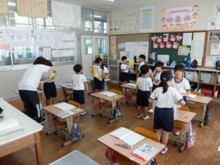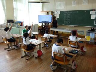 1年生は、1学期末に学習したことを思い出しながら、算数の練習問題に取り組んでいました。答え合わせの時は、元気よく手を挙げて発表することができました。