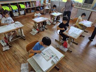 1年生は、初めて自分の絵の具セットを使っていました。筆やパレット、水入れ等の使い方を勉強した後、おそるおそる水入れの準備をしていました。パレットに絵の具を出した後、自由に筆を動かすのが楽しそうでした。