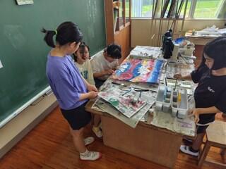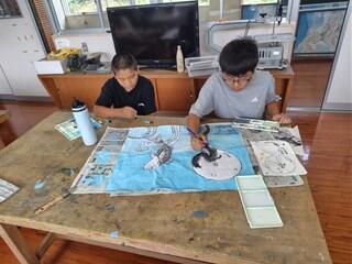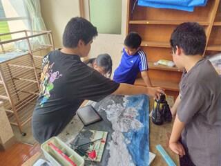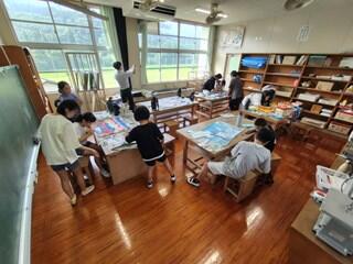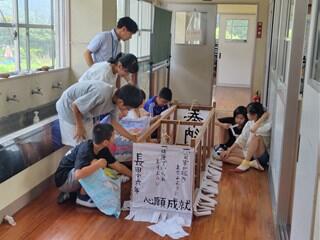 総合的な学習の時間と図工の時間を使って、大灯籠を作っています。地域に伝わる行事(六月灯)への参加の為に、6年生が代表して作っています。