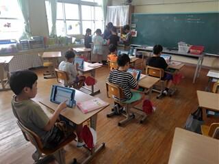 社会科では、町探検で分かったことや思ったことを、タブレット端末を使ってまとめる作業をしていました。用紙に下書きしたことを、分かりやすくまとめようと頑張っています。