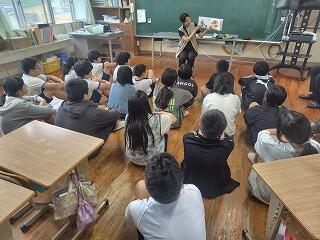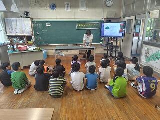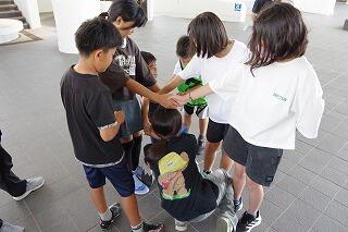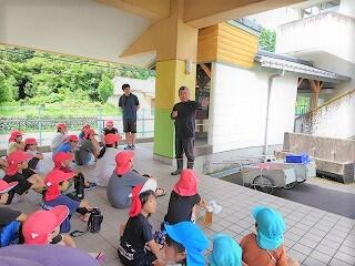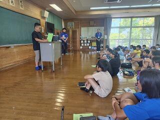 午前中は、屋内追跡ハイキングを行いました。日中は30℃を超える猛暑でしたが、日陰は涼しかったので熱中症の心配もそこまでしなくてもよく、楽しく活動することができました。それぞれのポイントで、頭と体を使い、協力しながら課題にチャレンジしていました。そして、活動の振り返りの際は、長田小の子がたくさん意見を発表することができました。