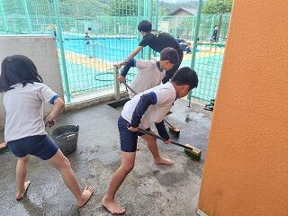3年生から6年生でプール掃除をしました。事前に保護者のボランティアの皆さんに汚れを落としていただいていたので、プール内やプールサイドの仕上げ磨き、更衣室やトイレなどの掃除を協力して行いました。