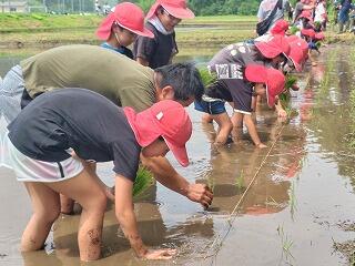 植え始めると、高学年の子は、毎年植えているので慣れた手つきで植えていました。それを見習いながら、低学年の子も次第に上手に植えられるようになっていきました。保護者の方にもお手伝いいただきながら、暑さに負けずに頑張って植え進むことができました。