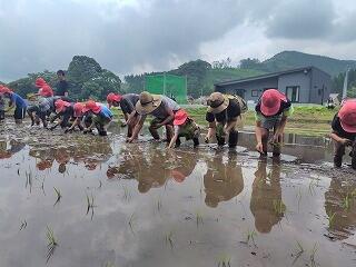 6月13日の午後、田植えを行いました。雨天の心配をしていましたが、一転して暑さを心配する天気になりました。