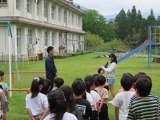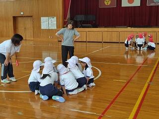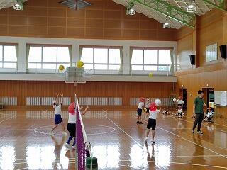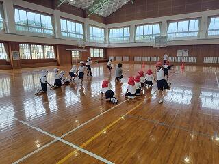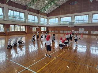 3・4年生は合同体育で、ソフトバレーボールの練習をしていました。真上に大きく投げ上げ、ボールの落下点に入ってキャッチする練習を上手にしていました。