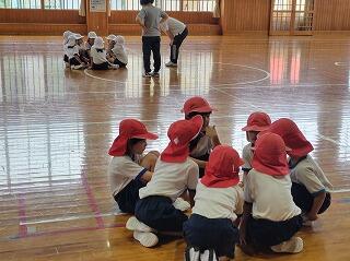 今日は、1・2年生が合同で折り返しリレーをしていました。自分たちで、走る順番や回る方向などを相談して、その作戦をもとに競争をしていました。2年生がリードしながら、みんなで頭を突き合わせて、話し合っている姿が見られました。2年生が頼もしく見えました。