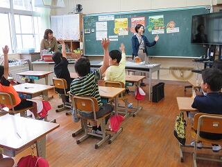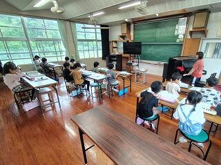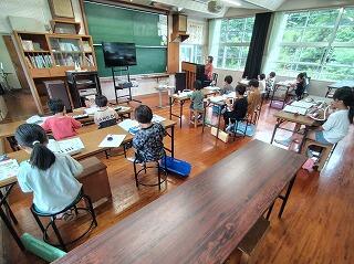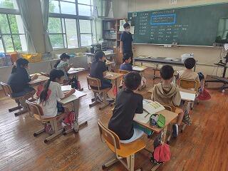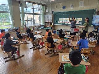 1年生は国語で、ことばの一つ一つの音を動作化しながら確認していました。一言ずつ手をたたき、伸ばす音では手を大きく動かすことで、ことばのリズムを体感していました。
