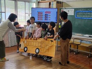 今日は、1年生が算数の授業で場面の動作化をして、人数の増減を確かめていました。エッホエッホとバスを走らせ、バス停で乗り降りした後の人数を確認していました。