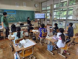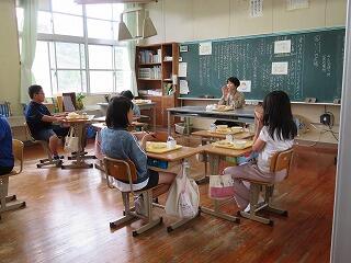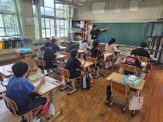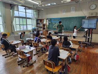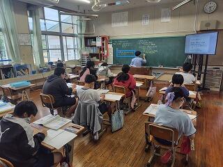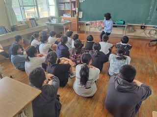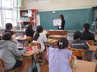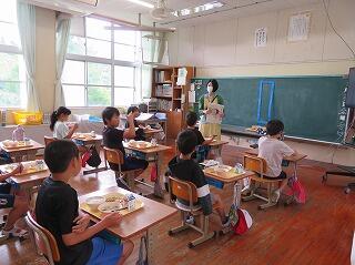 町内の栄養教諭の先生方が給食の時間に来校され、4・5・6年生とそれぞれ一緒に給食を食べながら、食についてのお話をしていただきました。