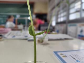 5年生は理科の学習で、種子の発芽と養分について学んでいました。発芽した後の様子をよく観察し、子葉になった種子がしわしわになっていることに気付き、学習課題を立てていました。