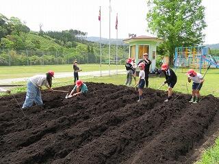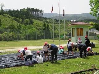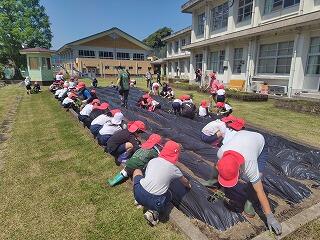 先週、高学年の子ども達が協力して、サツマイモの植えるための畝立てとマルチ張りをしました。
