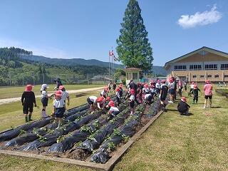 今週は、準備した畑に、全校の皆でサツマイモの苗を植えました。縦割り班で協力しながら、上級生が下級生のお世話をしながら植えていました。植え終わった後に、しっかり植わっていない苗を確認している子や、自主的に道具の後片付けをする子の姿が見られ、とても頼もしかったです。