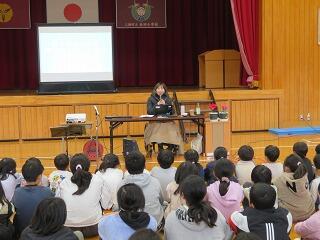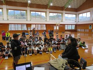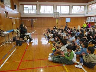 12/13(金)の5校時にシンガーソングライター、ラジオパーソナリティ、講師など多彩な活躍をされている「真北 聖子」さんを講師に迎えて、人権に関する講話をしていただきました。タイトルは「限りある人生を限りなく楽しむために~人生はUP to ME(自分次第)~」です。車椅子での生活の実際の様子や障がいを持つ人へどんな言葉かけや思いやりをしてあげればよいかなど、いろいろな話をしていただきました。最後に自ら作詞・作曲された歌を三曲(タイトルは「Calling」「MIYAZAKI」「GIFT」)も披露してくださいました。長田小の体育館に真北さんの美しい声が響き渡ると、子ども達は自然とリズムを取り、手をたたいていました。5年生の代表児童がお礼の言葉を発表した後、長田小児童も「虹」の合唱を披露しました。講演の最後には真北さんへサインをおねがいするたくさんの子ども達の姿も見られました。