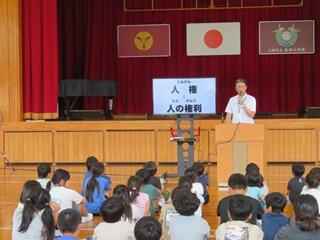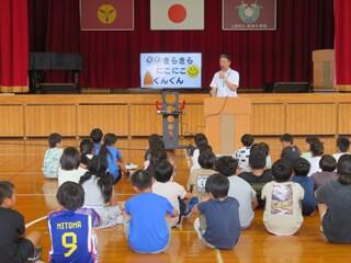 まず、2年生と4年生の代表児童が1学期を振り返っての作文発表を行いました。2人とも、自分のがんばったことを振り返るとともに、これからがんばりたいことも発表してくれました。