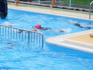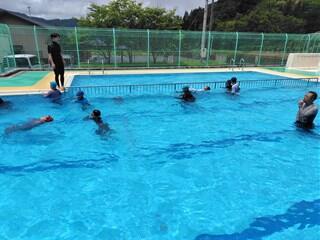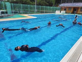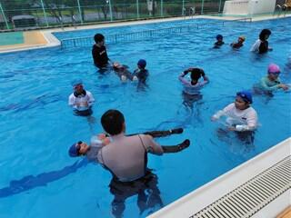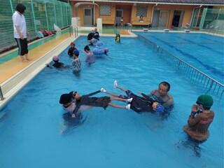 〇5・6年生は、流れを作ったプールで下流に足を向けての背浮きを練習した後、グループで背浮きの練習をし、後半は浮いて待っている友だちを助ける練習をしました。