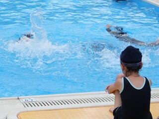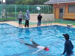 プールで水遊びの学習を行いました。1年生は、全員がプールの底から足を離して浮こうとすることができるようになりました。2年生は、蹴のびからバタ足で上手に進むことができるようになりました。