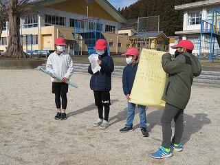 まずは体育館でお別れ集会をしました。お別れ集会では、1~5年生から6年生へ呼びかけをして、手作りのプレゼントをわたしました。どのプレゼントも6年生への感謝の気持ちが込められていて、6年生もとても喜んでいました。そのあとは、4・5年生が計画した借り物競争やドッジボール大会、ウォークラリーなどで、6年生との交流を深めました。その後は、待ちに待ったお弁当です。自分でお弁当の日に取り組んだ子もいて、とてもうれしそうに食べていました。楽しい一日をみんなで過ごすことができました。