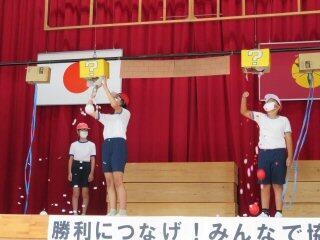 児童会による今年のスローガン発表の後、各団の団長がブロックを壊すと、