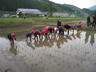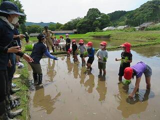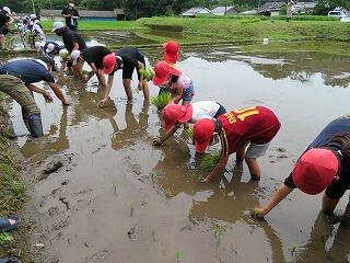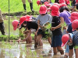 子どもたちは、田んぼのぬかるみに最初は悪戦苦闘しながらも、少しずつ慣れてくると、上手に植えることができました。秋の稲刈り、そして収穫が楽しみです。
