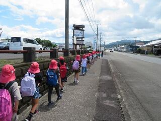 その後は椎八重公園まで歩いて向かいました。天候は曇りで、心地よい中ではありましたが、やはり距離があるので、6年生は1年生をサポートしつつ、全校のみんなへ向けて、「がんばるぞ!」と掛け声をかけながら向かいました。最後まで全校みんなでがんばって歩きました。