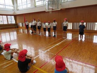 9月14日(木)に合同で参加する保育園児もいっしょに2回目の運動会の全体練習を行いました。開会式や閉会式、ラジオ体操の練習に取り組みました。優勝旗の返還や誓いの言葉、スローガン発表、優勝旗や応援トロフィー授与などいろいろな活動を確かめながら練習しました。どの児童も園児も規律ある行動が取れました。