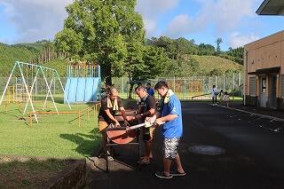 子どもたちはグリーンデーの班ごとに運動場のトラックに生えた草を頑張って抜いてくれました。15分という限られた時間でしたが、どの班も一輪車がいっぱいになるくらいの草がとれました。