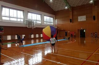 中から色のついた風船や紙吹雪が落ちてきて、体育館の中に歓声が響きました。