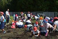 昨日の稲刈りに引き続き、今日はさつまいもの収穫を行いました。今年は、ひまわり保育園ながた分園の園児たちと一緒に楽しく収穫することができました。