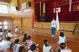 都城ドライビングスクールの方に来ていただき、横断歩道の渡り方について学びました。また、人に見立てた段ボールが車とぶつかる様子を間近で見て、交通事故の怖さも見て学ぶことができました。最後には、代表児童が、「気を付けて毎日を過ごしていきます。」と、お礼の言葉を述べることができました。