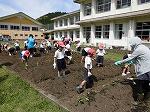 新型コロナウィルス感染症拡大予防による臨時休業の影響で遅れていた「さつまいもづくり」をようやく始めることができました。午前中に4・5・6年生で畝づくりをして、5時間目に全校で苗植えをしました。今年もたくさんサツマイモが収穫できるように、これからみんなで草取りや水まきのお世話をしていきます。