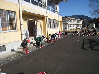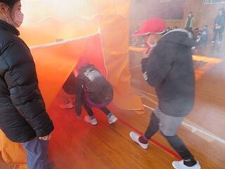 避難後は、御池少年自然の家の方に来て頂き、煙ハウスや水消火器の体験活動を行いました。煙ハウスでは、煙で前が見えなくなり、自分がどこに行けばいいのかが分からなくなってこわかったといった感想が出るなど、火事が起こったときの避難の難しさを感じ取ることができたようです。その後は水消火器を使って、初期消火訓練も行いました。