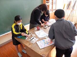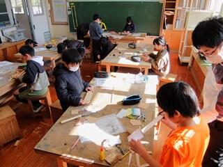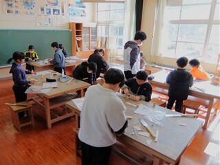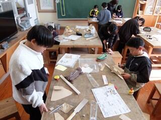 4年生は「カクカク板を 組み合わせたら」の学習でした。種類の異なる板を切ったり貼ったり打ち付けたりしながら、イメージしたものを作っていました。