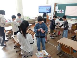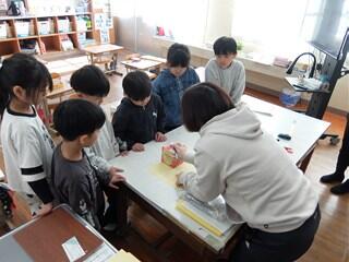 2年生は算数科で「はこの形」の学習をしていました。持ち寄った箱を使って、面の数を数えたり、面の形を紙に写し取ったりしていました。